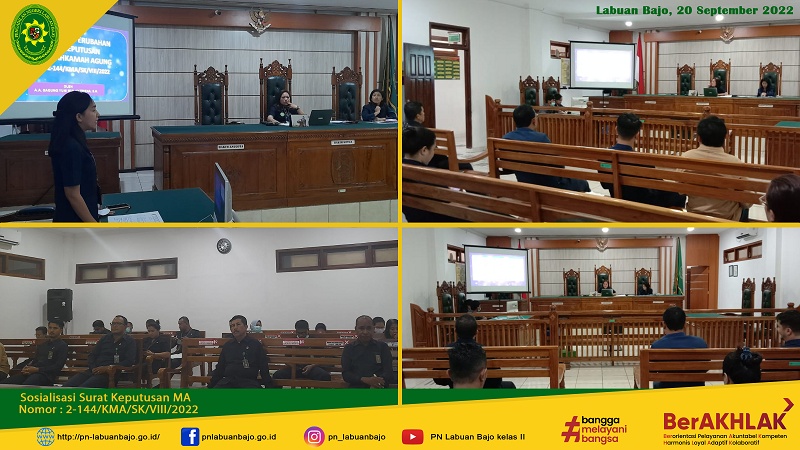 Selasa (20/09/2022) pukul 13.30 WITA Pengadilan Negeri Labuan Bajo Kelas II telah melaksanakan sosialiasi pelaksanaan SK KMA Nomor 2-144/KMA/SK/VIII/2022 tentang Standar Pelayanan Informasi Publik di Pengadilan bagi seluruh jajaran pegawai yang berada di PN Labuan Bajo. Sosialiasi dipimpin langsung oleh Ketua PN Labuan Bajo Ibu Anak Agung Sagung Yuni Wulantrisna, S.H dan didampingi Ibu Wakil Ketua. Diharapkan dengan diadakannya sosialisasi ini maka pelayanan informasi di PN Labuan Bajo dapat berjalan sesuai dengan ketentuan yang berlaku demi terwujudnya keterbukaan informasi publik yang optimal.