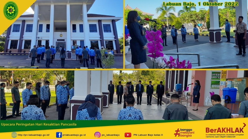 Labuan Bajo | Sabtu, (1/10/2022), bertempat di halaman utama kantor Pengadilan Negeri Labuan Bajo Kelas II. Ibu Anak Agung Sagung Yuni Wulantrisna, S.H. (Ketua Pengadilan Negeri Labuan Bajo) berkesempatan langsung menjadi inspektur upacara peringatan Hari Kesaktian Pancasila.
