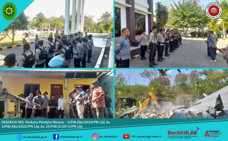 Tim Eksekusi yang dipimpin oleh Panitera Pengadilan Negeri Labuan Bajo bersama Tim Pengamanan dari Polres Manggarai Barat. Proses eksekusi pengosongan dan penyerahan berhasil dilaksanakan dengan lancar dan tertib, yang diakhiri dengan pembacaan dan penyerahan Berita Acara Eksekusi dari Tim Eksekusi Pengadilan Negeri Labuan Bajo kepada Pemohon Eksekusi.