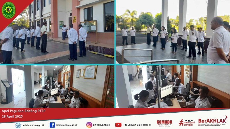 Labuan Bajo (28/04/2025), Pengadilan Negeri Labuan Bajo melaksanakan apel pagi sebagai bentuk pembinaan dan arahan dalam pelaksanaan tugas pokok dan fungsi masing-masing aparatur sesuai amanah dalam Peraturan Mahkamah Agung Republik Indonesia. Bertindak selaku Pembina Apel yaitu Ketua Pengadilan Negeri Labuan Bajo ibu Ida Ayu Widyarini, SH. M.Hum apel pagi diikuti oleh Para Hakim, Panitera, Sekretaris, & seluruh aparatur PN Labuan Bajo.